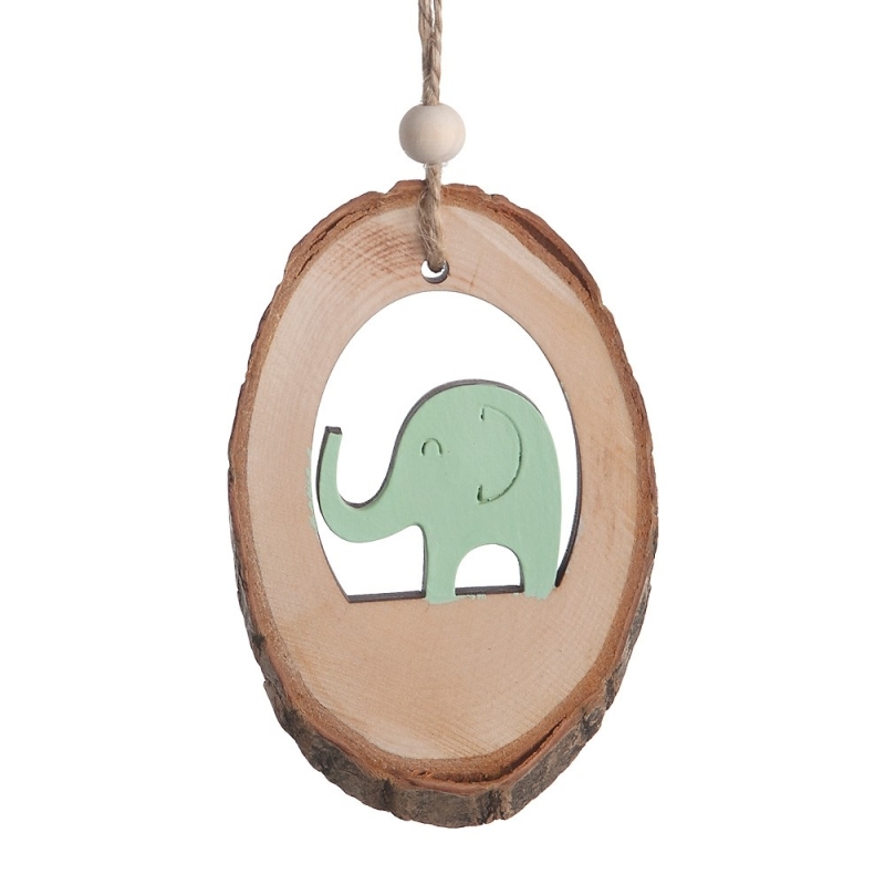Ξύλινος κρεμαστός διακοσμητικός φυσικός κορμός με βεραμάν ελέφαντας στο εσωτερικό. Διακοσμημένος με ξύλινη χάντρα.