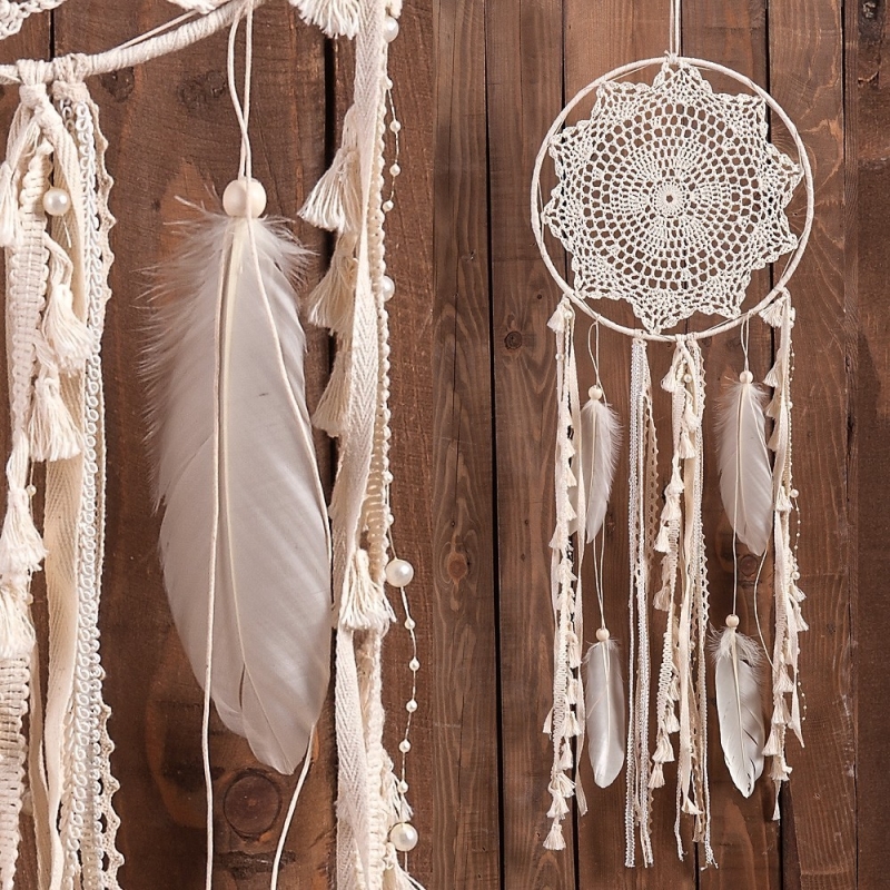 Υφασμάτινη κρεμαστή διακοσμητική πλεκτή ονειροπαγίδα σε χρώμα ivory. Διακοσμημένη με φτερά,κορδέλες και πέρλες. Ιδανική για ethnic στολισμούς και διακοσμήσεις.