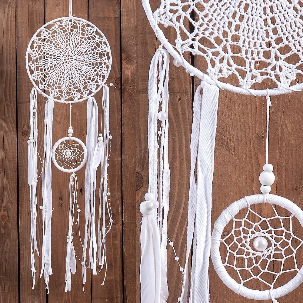 Υφασμάτινη κρεμαστή διακοσμητική πλεκτή διπλή ονειροπαγίδα, σε χρώμα λευκό. Διακοσμημένη με φτερά,κορδέλες και πέρλες. Ιδανική για ethnic στολισμούς και διακοσμήσεις.
