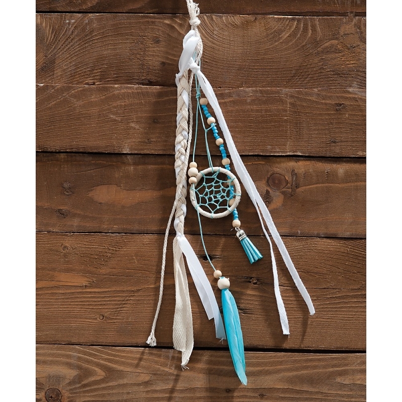 Υφασμάτινη κρεμαστή διακοσμητική πλεκτή ονειροπαγίδα σε χρώμα σιέλ. Διακοσμημένη με χάντρες, κορδέλες σε πλεξούδα και φούντα. Ιδανική για ethnic στολισμούς και διακοσμήσεις.