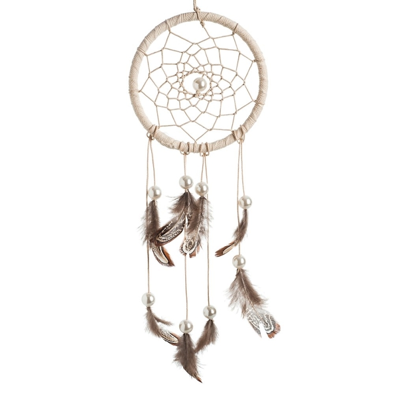 Υφασμάτινη κρεμαστή διακοσμητική πλεκτή ονειροπαγίδα σε χρώμα εκρού. Διακοσμημένη με καφέ φτερά και πέρλες. Ιδανική για ethnic στολισμούς και διακοσμήσεις.