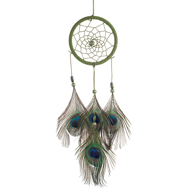 Υφασμάτινη κρεμαστή διακοσμητική πλεκτή ονειροπαγίδα σε χρώμα λαδί. Διακοσμημένη με φτερά, χάντρες και μάτια. Ιδανική για ethnic στολισμούς και διακοσμήσεις.