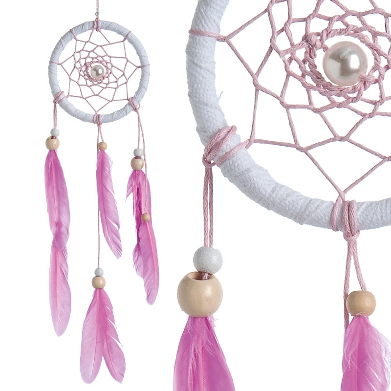 Υφασμάτινη κρεμαστή διακοσμητική πλεκτή ονειροπαγίδα σε χρώμα ροζ. Διακοσμημένη με πέρλα στο κέντρο, κρεμαστά φτερά και ξύλινες χάντρες. Ιδανική για ethnic στολισμούς και διακοσμήσεις.