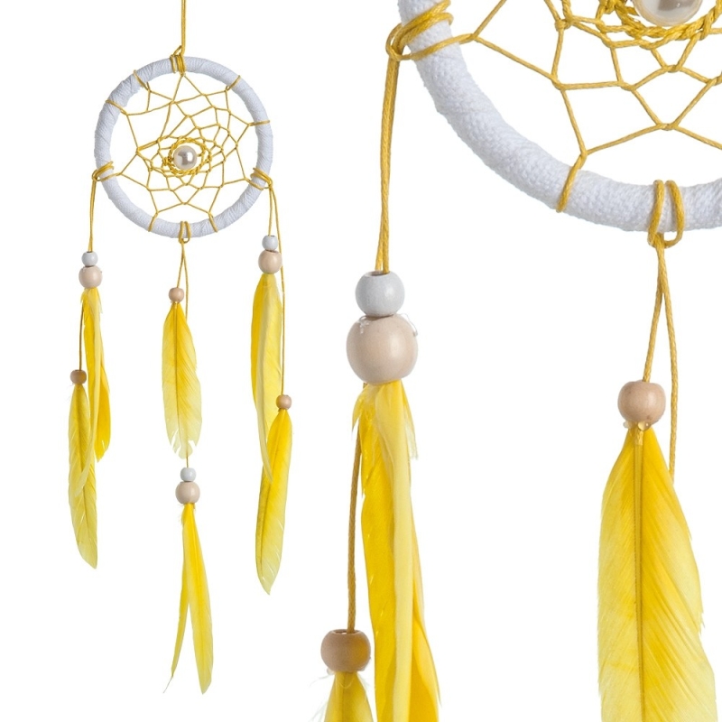 Υφασμάτινη κρεμαστή διακοσμητική πλεκτή ονειροπαγίδα σε χρώμα κίτρινο. Διακοσμημένη με πέρλα στο κέντρο, κρεμαστά φτερά και ξύλινες χάντρες. Ιδανική για ethnic στολισμούς και διακοσμήσεις.