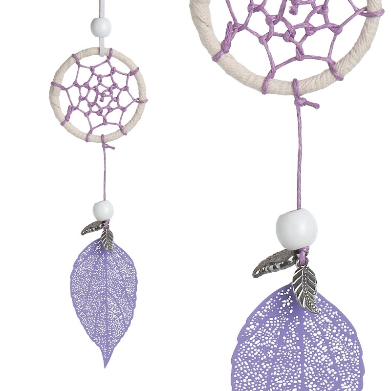 Υφασμάτινη κρεμαστή διακοσμητική πλεκτή ονειροπαγίδα σε χρώμα μωβ. Διακοσμημένη με μεταλλικά φύλλα και ξύλινες χάντρες. Ιδανική για ethnic στολισμούς και διακοσμήσεις.