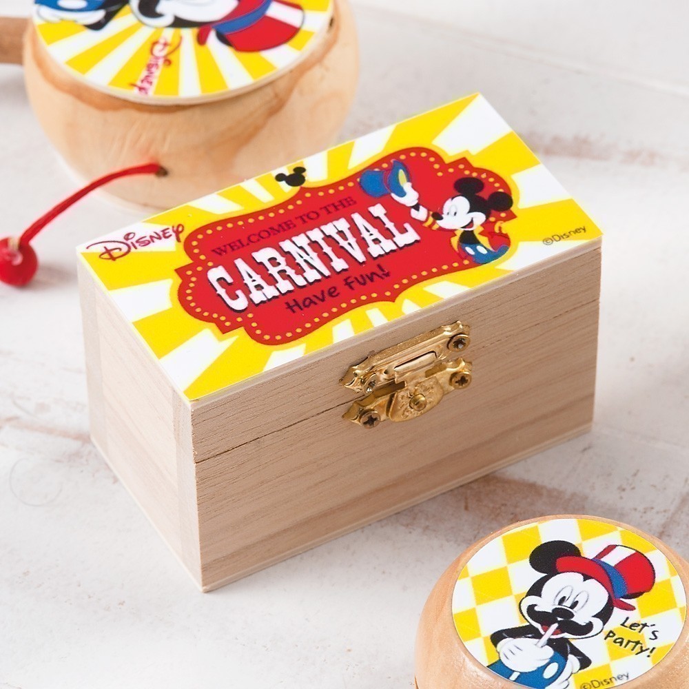 Disney ξύλινο natural σεντούκι με μεταλλικό κούμπωμα. Είναι διακοσμημένο με αυτοκόλλητο print Mickey Carnival σε κίτρινες-κόκκινες αποχρώσεις.