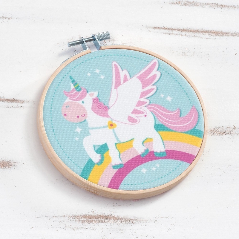 Διακοσμητικό χειροποίητο στρογγυλό τελάρο κεντήματος με διάμετρο 13cm. Είναι ντυμένο με ύφασμα print μονόκερος.