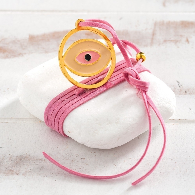 Χειροποίητο διακοσμητικό βότσαλο σε λευκό χρώμα. Είναι στολισμένο με χρυσό ματί πλαίσιο με ροζ λεπτομέρειες και κορδόνι suede σε ροζ χρώμα.