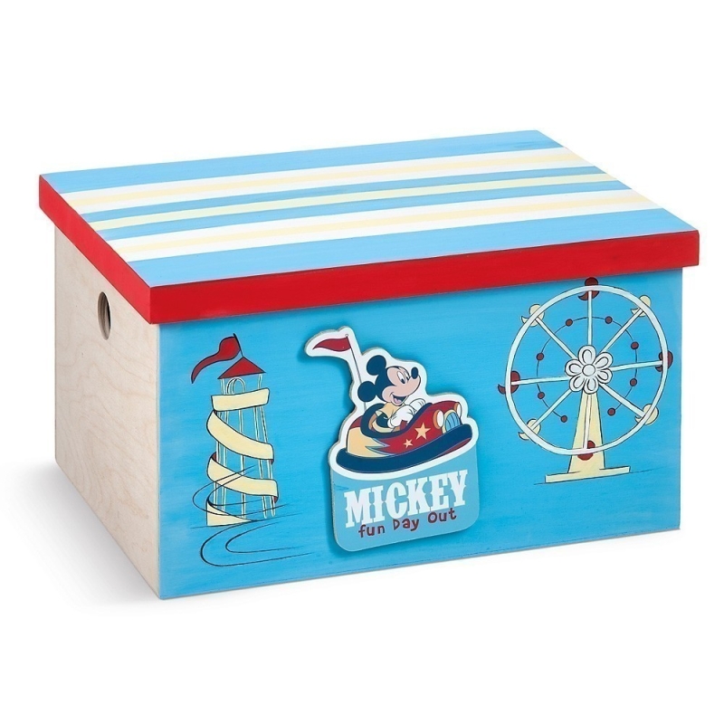 Disney natural κασέλα, συσκευασία βάπτισης με θέμα τον Mickey Fun Day Out. Στο μπροστινό τμήμα της κασέλας, το φόντο είναι ζωγραφισμένο σε τιρκουάζ απόχρωση και στο καπάκι έχουν προστεθεί ρίγες σε κίτρινο και λευκό χρώμα. Το θέμα είναι ο Mickey στο λούνα πάρκ. Η ξύλινη παράσταση απεικονίζει τον Mickey σε συγκρουόμενο αυτοκίνητο. Στο φόντο είναι επιπλέον ζωγραφισμένες μία ρόδα και ένας φάρος.