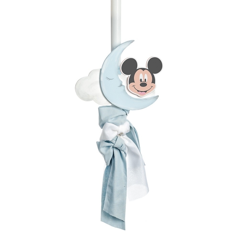 Disney Mickey λαμπάδα βάπτισης. Το δέσιμο έχει γίνει με σιέλ και λευκό βαμβακερό ύφασμα σε ατημέλητους φιόγκους. Στο πάνω μέρος είναι διακοσμημένη με τη χαμογελαστή ξύλινη φατσούλα του Mickey και ένα σιέλ φεγγαράκι πάνω σε άσπρο σύννεφο.