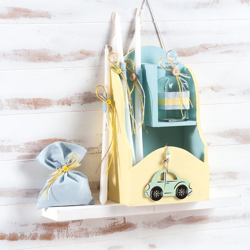 Ξύλινη κρεμαστή συσκευασία βαμμένη βεραμάν-κίτρινη που χρησιμεύει ως ράφι λαδικών. Στο μπροστινό μέρος διακοσμείται με ξύλινο σκαραβαίο. Ο κωδικός περιλαμβάνει τα 3 κεράκια, το σαπούνι μέσα σε πουγκάκι και το μπουκάλι του λαδιού, όλα στολισμένα σε σιέλ-κίτρινες αποχρώσεις