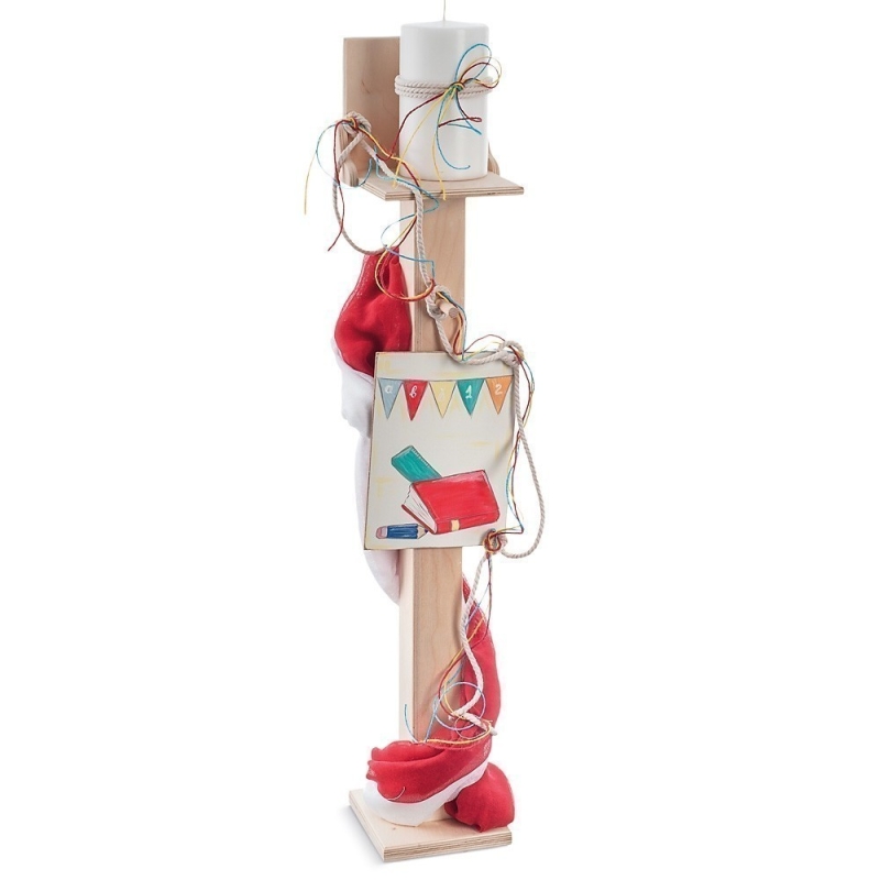 Ξύλινος natural κηροστάτης-κρεμάστρα διακοσμημένος με ξύλινο καδράκι που απεικονίζει διάφορα σχολικά είδη.Από το πίσω μέρος του κηροστάτη μέχρι κάτω πέφτει ριχτή γάζα λευκή και κόκκινη ενώ κορδόνια σε αποχρώσεις σιέλ-κίτρινες-κόκκινες διακοσμούν τον κηροστάτη από πάνω μέχρι κάτω δεμένα σε διάφορα σημεία.