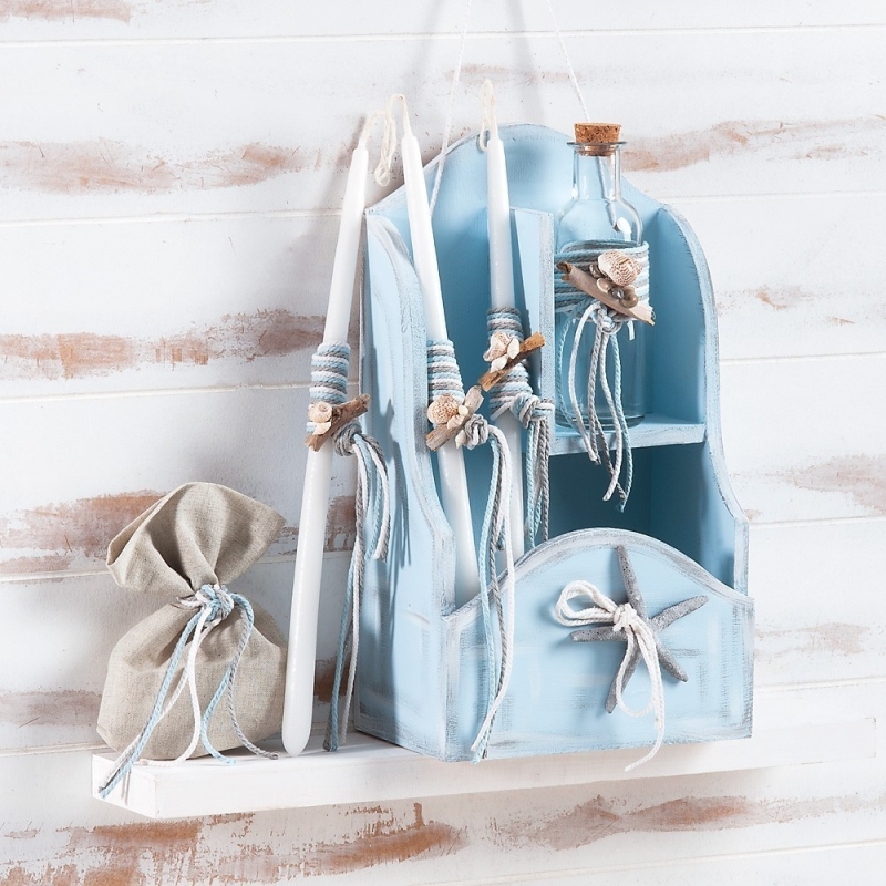 Ξύλινη σιέλ κρεμαστή συσκευασία, ζωγραφισμένη στο χέρι με σβησίματα λευκά-γκρι και διακοσμημένη με διάφορα ναυτικά στοιχεία όπως αστερίες και κοχύλια. Η συσκευασία περιλαμβάνει 3 κεριά, σαπούνι μέσα σε πουγκάκι και μπουκάλι λαδιού, όλα στολισμένα σε ναυτικό στυλ.