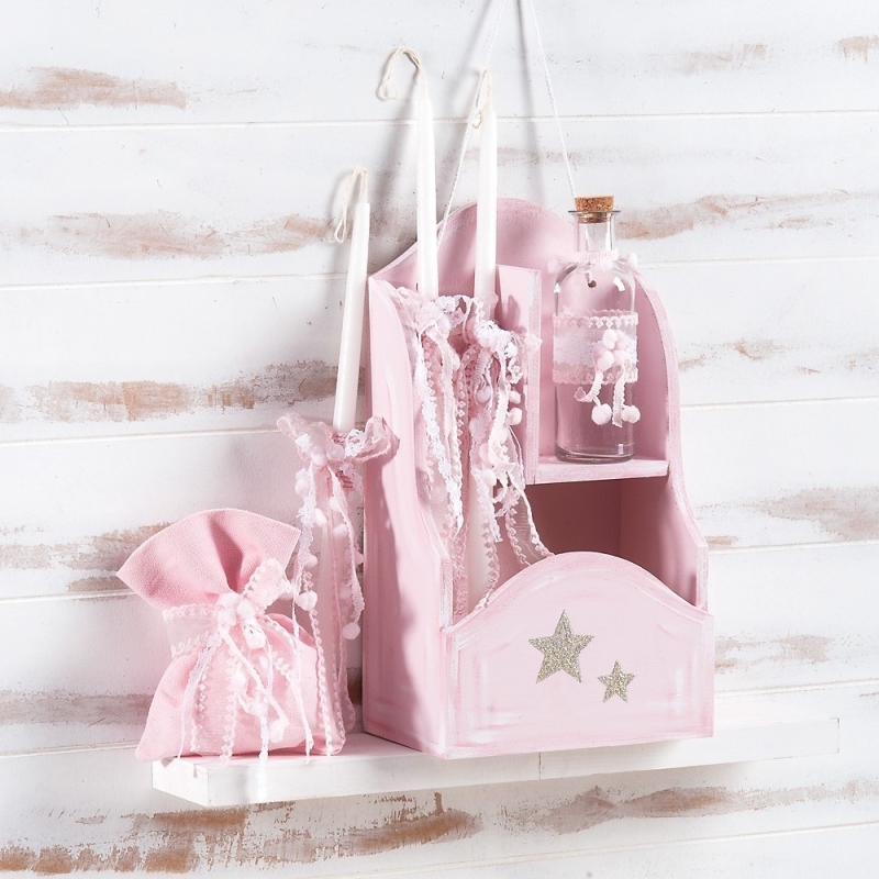 Ξύλινη ροζ κρεμαστή συσκευασία,που χρησιμεύει ως ράφι λαδικών, ζωγραφισμένη στο χέρι με λευκά σβησίματα και με αστεράκια χρυσά. Είναι διακοσμημένη με κορδέλες, δαντέλες και κορδόνια με pom pom σε λευκές-ροζ αποχρώσεις. Η συσκευασία περιλαμβάνει 3 κεριά, σαπούνι μέσα σε πουγκάκι και μπουκάλι λαδιού.