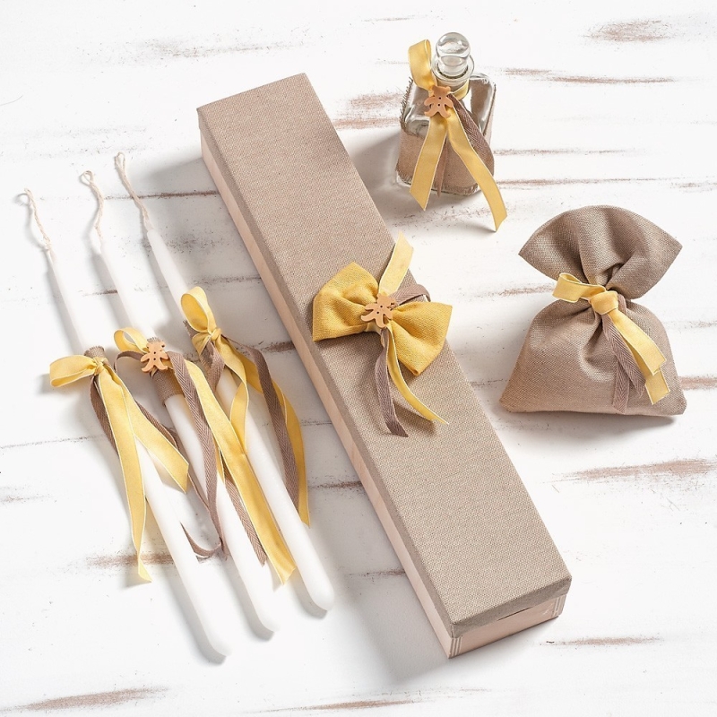 Ξύλινο κουτί συσκευασίας παραλληλόγραμμο ντυμένο με ύφασμα καφέ και διακοσμημένο με υφασμάτινο φιόγκο κίτρινο και ξύλινο μικρό αρκουδάκι . Ο κωδικός περιλαμβάνει τα 3 κεράκια, το σαπούνι μέσα σε πουγκάκι και το μπουκάλι του λαδιού, όλα στολισμένα σε κίτρινες-καφέ αποχρώσεις