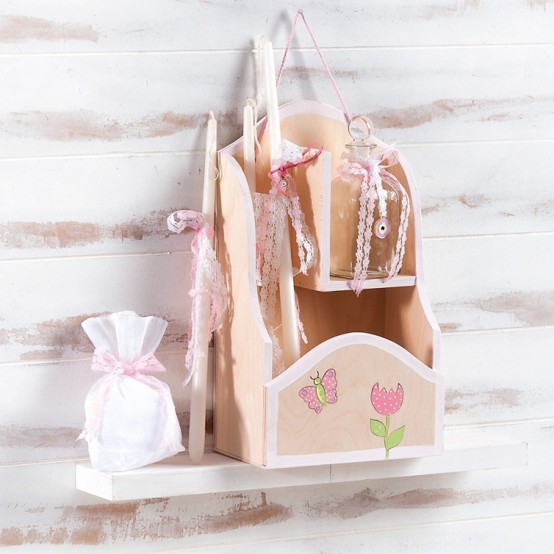 Ξύλινη natural κρεμαστή συσκευασία, ζωγραφισμένη στο χέρι με λουλούδι και πεταλούδα και διακοσμημένη κορδέλα δαντέλα λευκή και ροζ. Η συσκευασία περιλαμβάνει 3 κεριά, σαπούνι μέσα σε πουγκάκι και μπουκάλι λαδιού, όλα στολισμένα σε αποχρώσεις λευκές-ροζ.