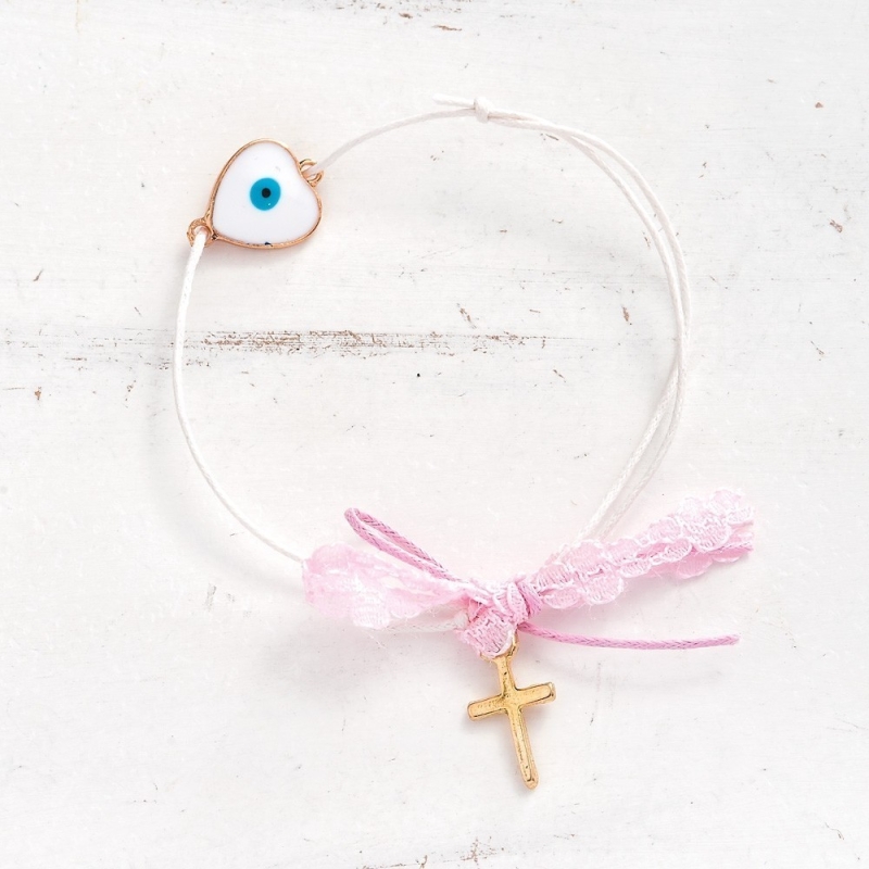 Μαρτυρικό βραχιόλι με κερωμένο κορδόνι λευκό,φίλντισι σταυρουδάκι ροζ και μάτι καρδιά.