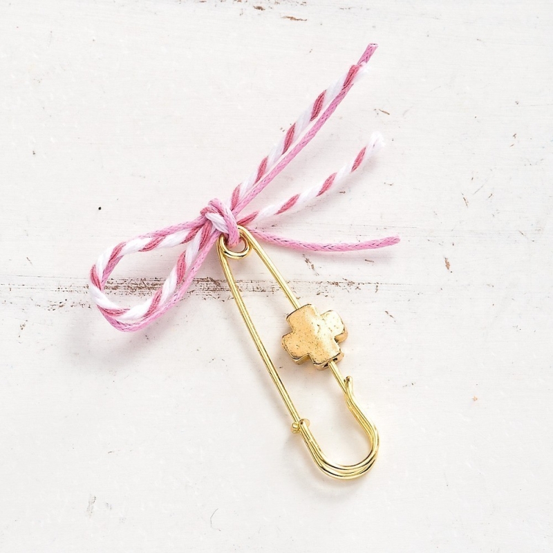 Μαρτυρικό σε χρυσή παραμάνα με σταυρό επίχρυσο,βαμβακερό δίχρωμο κορδόνι λευκό-ροζ και κερωμένο ροζ.