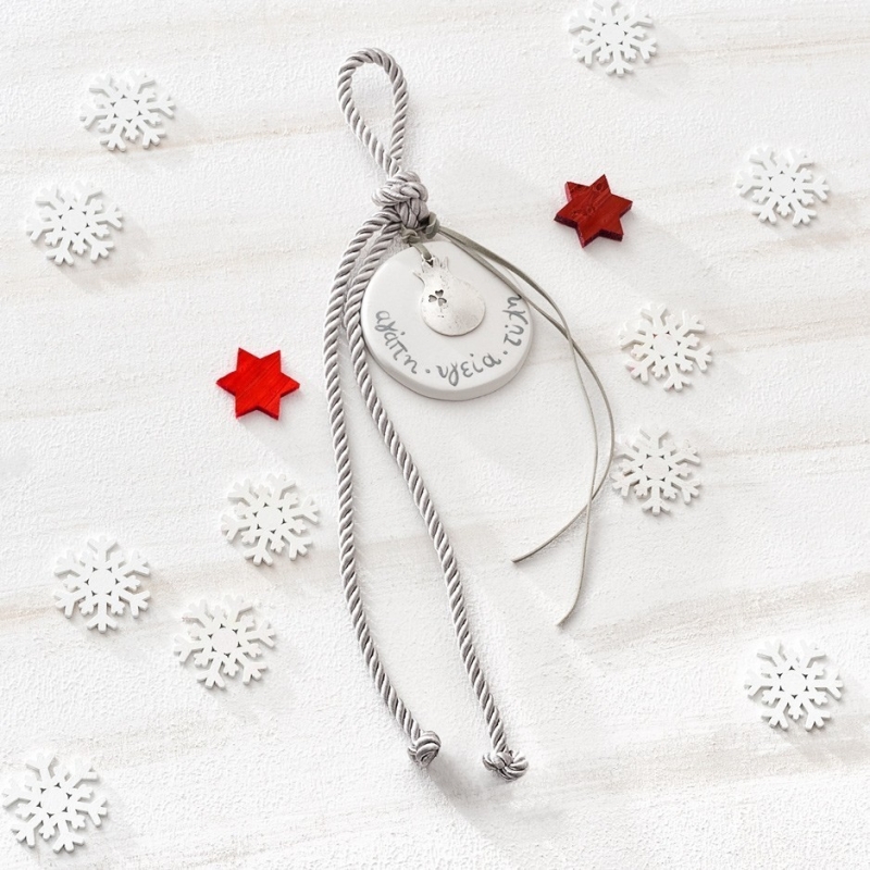 Χριστουγεννιάτικο κρεμαστό γούρι με κεραμικό & μεταλλικό μοτίφ ρόδι σε ασημί χρώμα.
