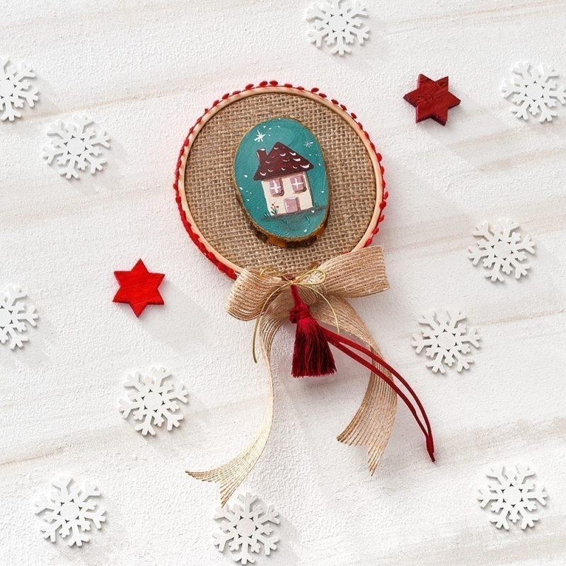 Χριστουγεννιάτικο διακοσμητικό τελάρο με ζωγραφιστό κορμό ξύλου που απεικονίζει ένα χριστουγεννιάτικο σπιτάκι.