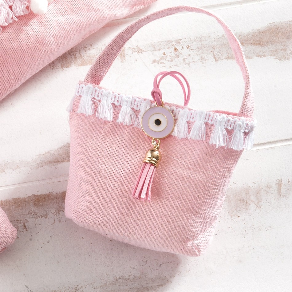 Τσαντάκι λινό σε χρώμα ροζ διακοσμημένο με λευκά κρόσια. Διαφορετικές διαστάσεις διατίθενται κατόπιν συννενόησης.