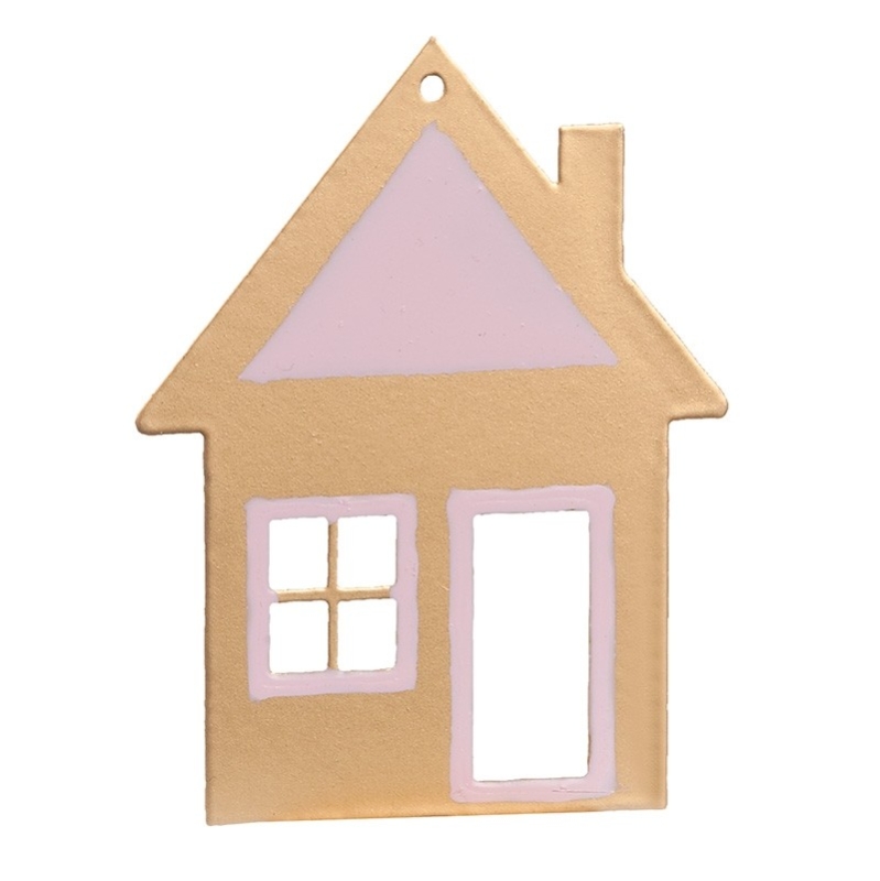Μεταλλικό κρεμαστό διακοσμητικό σπιτάκι σε χρώμα χρυσό με σκεπή και με λεπτομέρειες σε ροζ χρώμα. Κατάλληλο για διακοσμήσεις και χειροποίητες κατασκευές