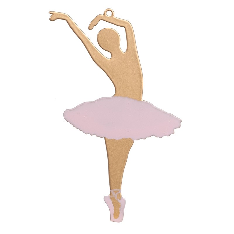 Μεταλλική κρεμαστή διακοσμητική μπαλαρίνα σε χρώμα χρυσό με φούστα και παπουτσάκια ροζ. Κατάλληλη για διακοσμήσεις και χειροποίητες κατασκευές