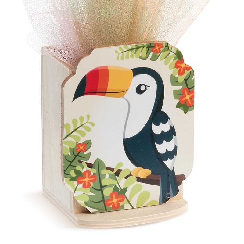 Ξύλινη μολυβοθήκη σε natural χρώμα. Διακοσμημένο με κοπτικό toucan.