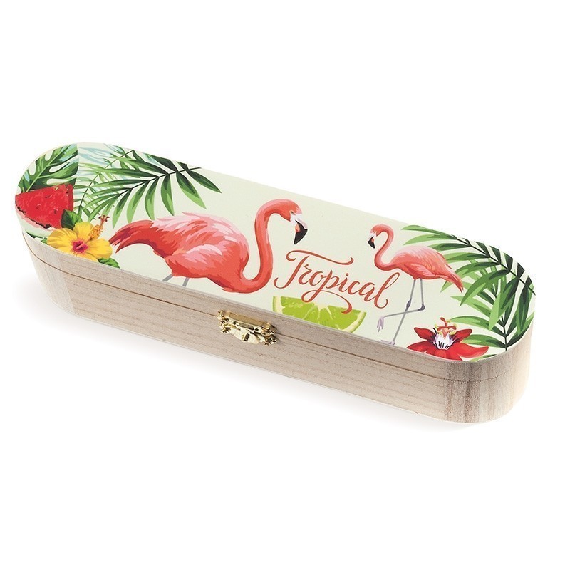 Ξύλινη natural κασετίνα με μεταλλικό κούμπωμα. Είναι διακοσμημένη με αυτοκόλλητο print flamingo.