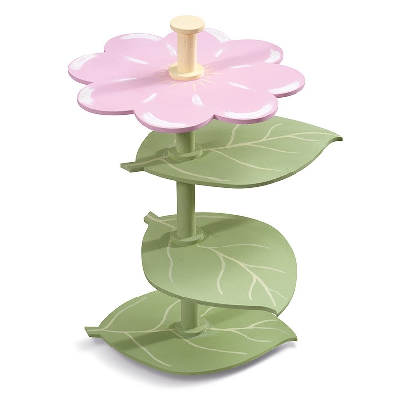 Ξύλινη διακοσμητική τουρτιέρα με ροζ μαργαρίτα και 3 επίπεδα σε σχήμα φύλλου σε πράσινο χρώμα.
