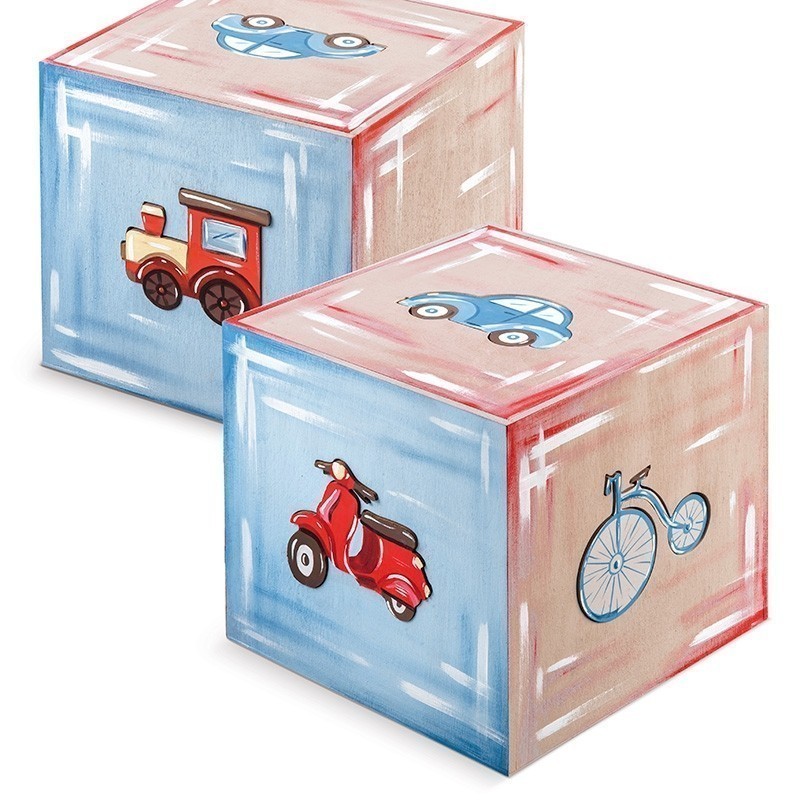 Ξύλινος natural κύβος,συσκευασία βάπτισης βαμμένος σε φυσική-σιέλ και κόκκινη απόχρωση με σβησίματα λευκά και κόκκινα και συνοδευόμενος από ξύλινα κοπτικά οχήματα (βέσπα,σκαραβαίο,ποδήλατο και τρένο).Το κουτί λειτουργεί και σαν παιχνιδόκουτο στο οποίο το παιδί προσπαθεί να ταιριάξει τα σωστά οχήματα στα σωστά κενά κάθε πλευράς.