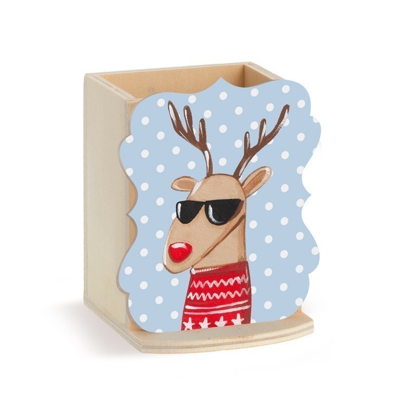 Ξύλινη μολυβοθήκη σε natural χρώμα. Διακοσμείται με κοπτικό πάνω στο οποίο απεικονίζεται ο τάρανδος των Χριστουγέννων σε αποχρώσεις κόκκινες πάνω σε σιέλ πουά φόντο.