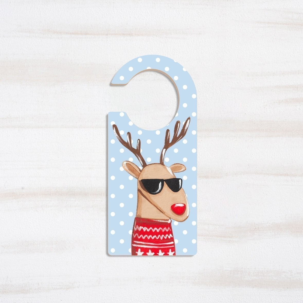 Ξύλινο διακοσμητικό πόρτας print, πάνω στο οποίο απεικονίζεται ο τάρανδος των Χριστουγέννων σε αποχρώσεις κόκκινες πάνω σε σιέλ πουά φόντο.