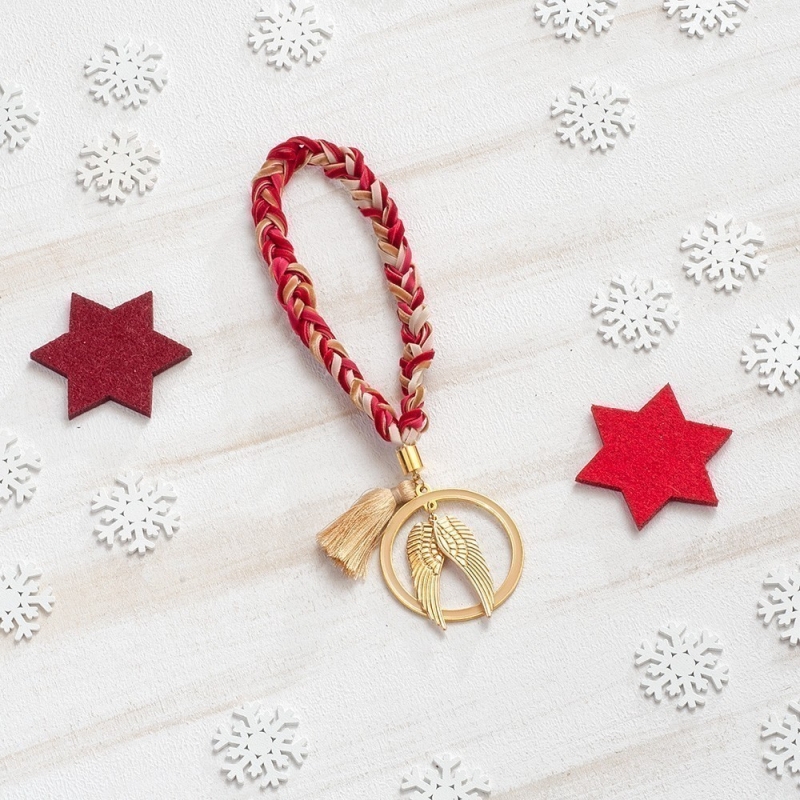 Γούρι κρεμαστό με φτερά χρυσά μέσα σε στρογγυλό πλαίσιο. Το γουράκι κρέμεται από πλεγμένες βελούδινες κορδέλες σε αποχρώσεις κόκκινες-καφέ και εκρού.