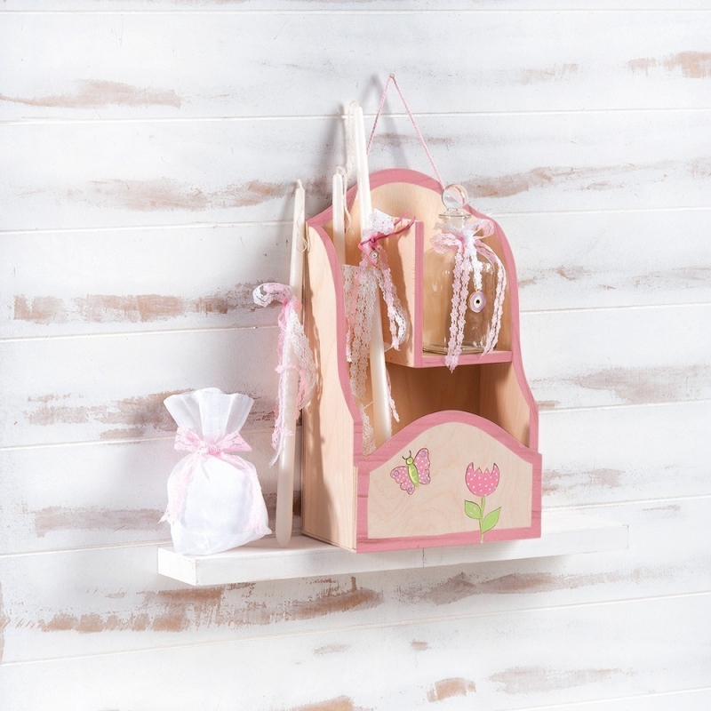 Ξύλινη natural κρεμαστή συσκευασία,ζωγραφισμένη στο χέρι με πεταλούδα και λουλούδι σε ροζ-πράσινες αποχρώσεις και με ροζ λεπτομέρειες περιμετρικά.Η συσκευασία περιλαμβάνει 3 κεριά,σαπούνι μέσα σε πουγκάκι και μπουκάλι λαδιού,όλα στολισμένα σε λευκά-ροζ
