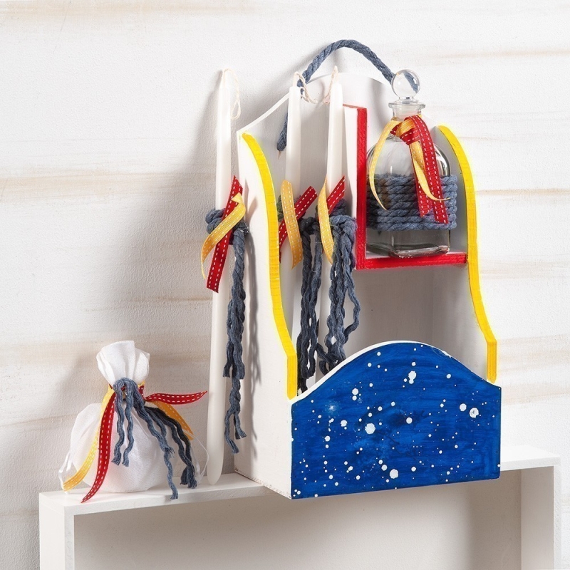 Ξύλινη κρεμαστή συσκευασία σε αποχρώσεις του λευκού και blue navy, απεικονίζοντας το διάστημα. Η συσκευασία περιλαμβάνει στολισμένα 3 κεριά,σαπούνι μέσα σε πουγκάκι και μπουκάλι λαδιού.