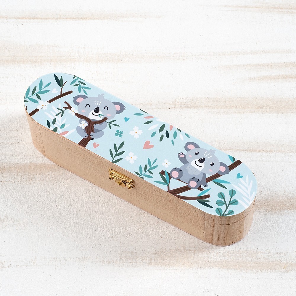 Ξύλινη natural κασετίνα με μεταλλικό κούμπωμα. Είναι διακοσμημένη με αυτοκόλλητο print Koala.