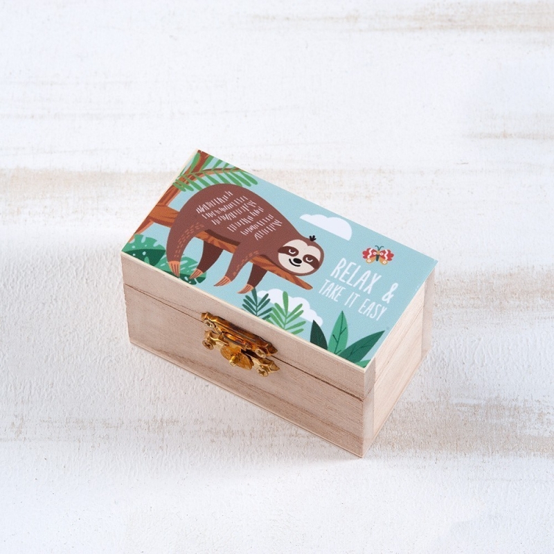 Ξύλινο natural σεντούκι με μεταλλικό κούμπωμα. Είναι διακοσμημένο με αυτοκόλλητο print Βραδύποδας.