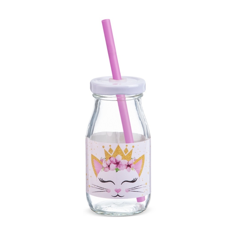 Γυάλινο μπουκάλι γάλακτος 200ml με λευκό μεταλλικό καπάκι. Συνοδεύεται από πολύχρωμα καλαμάκια. Είναι διακοσμημένο με αυτοκόλλητο print Γάτα.