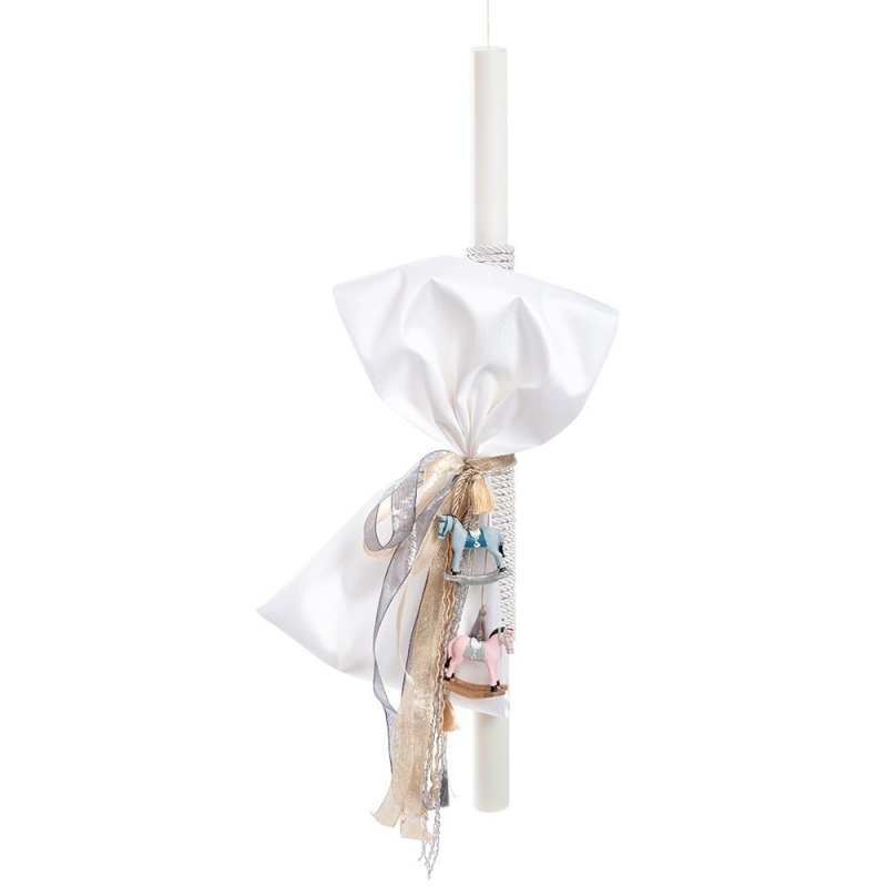 Λαμπάδα βάπτισης με θέμα καρυοθραύστης. Είναι στολισμένη με κορδόνι, φιόγκο σαντούκ σε λευκό χρώμα και αλογάκια σιέλ και ροζ.