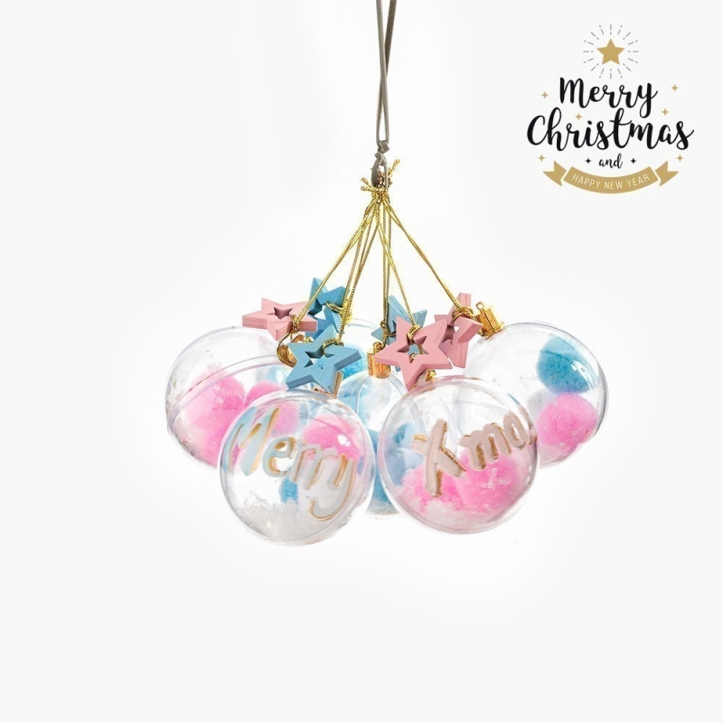 Χριστουγεννιάτικο στολίδι- κρεμαστή ακρυλική μπάλα. Στο εσωτερικό είναι διακοσμημένη με ροζ, λευκά & σιέλ pom pom & πασπαλισμένη με χιόνι, ενώ στο τελείωμα της έχει τοποθετηθεί αστεράκι σε αντίστοιχα χρώματα. Η ζωγραφιστή ευχή MERRY XMAS ολοκληρώνει το ιδανικό στολίδι για το Χριστουγεννιάτικο δέντρο σας. Συσκευασία των 6 τεμαχίων.