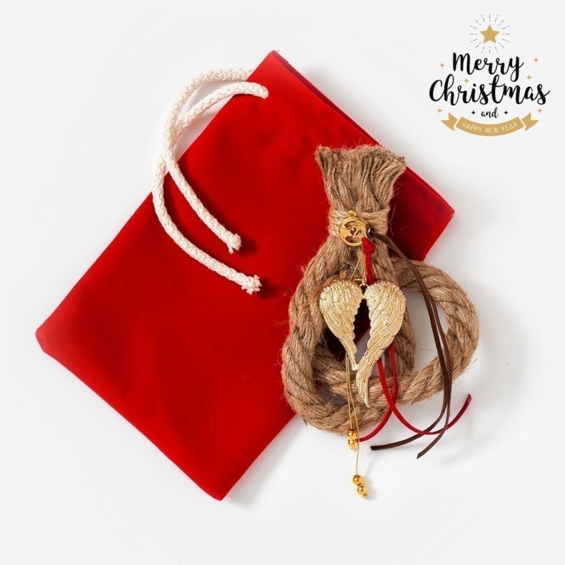 Χριστουγεννιάτικο γούρι με μεταλλικά χρυσά φτερά. Το γούρι είναι τοποθετημένο σε κατασκευή από χοντρό σπάγγο (15mm) και διακοσμημένο με μεταλλικό χρυσό μοτίφ. Συνοδεύεται από κόκκινο βελούδινο πουγκί.