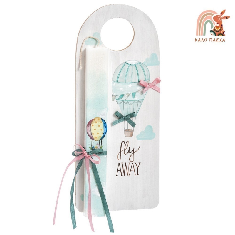 Πασχαλινή λαμπάδα με θέμα το αερόστατο και μότο fly away. Το πασχαλινό δωράκι περιλαμβάνει: