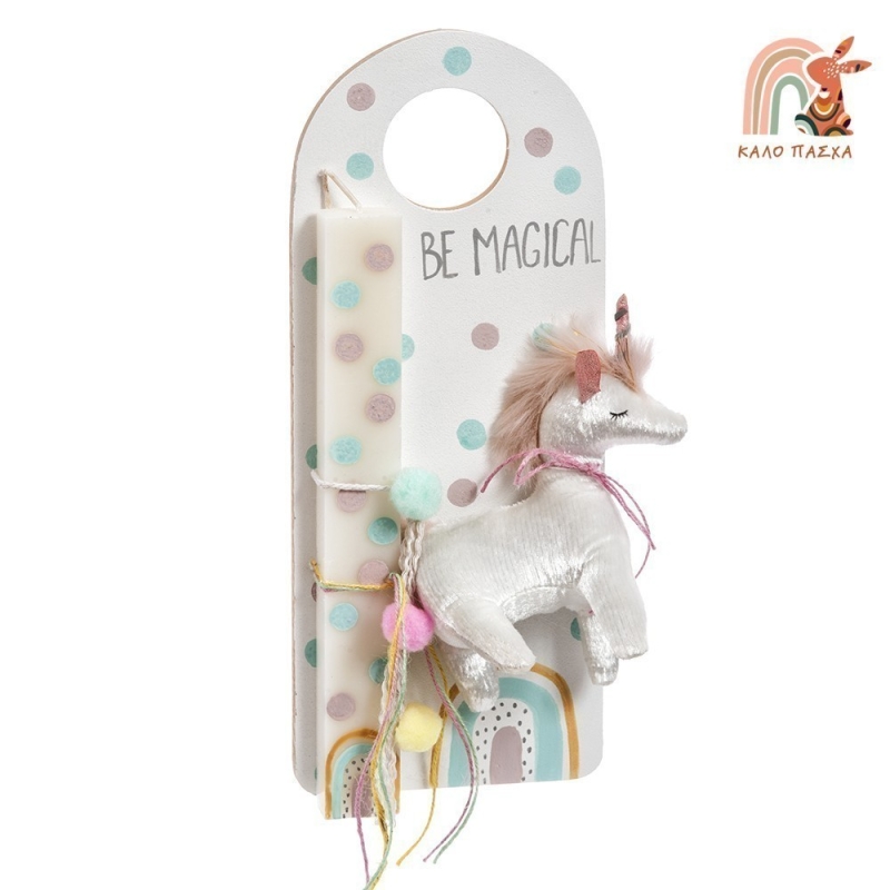 Πασχαλινή λαμπάδα με θέμα το μονόκερο και μότο be magical. Το πασχαλινό δωράκι περιλαμβάνει: