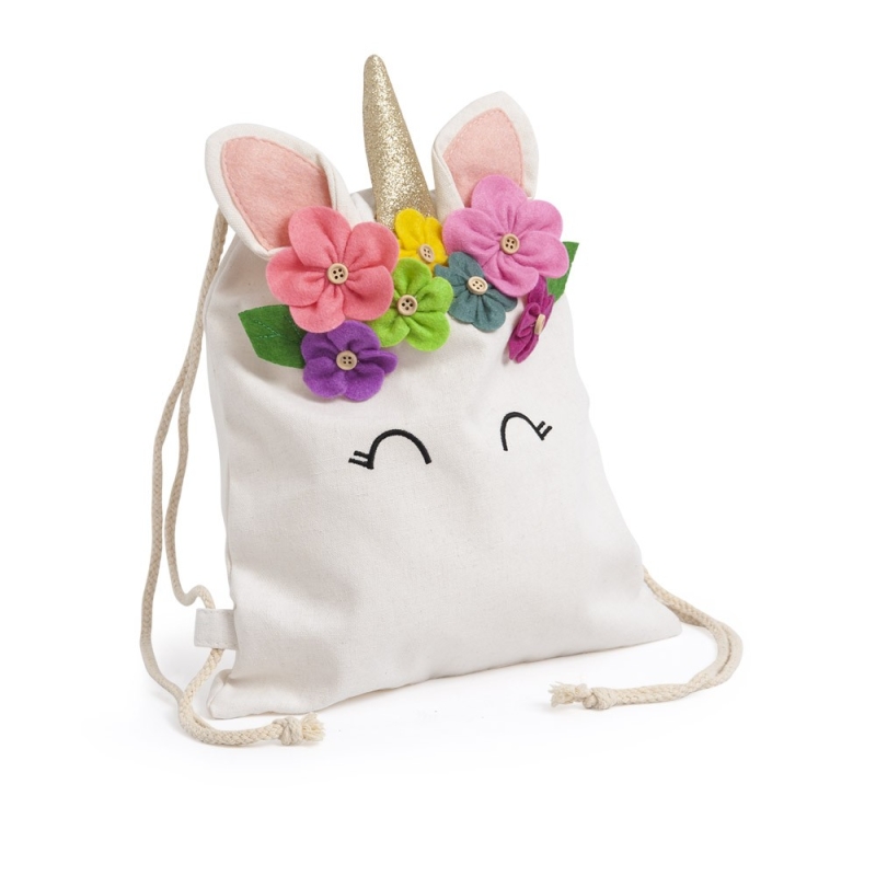 Υφασμάτινο Backpack με σχέδιο μονόκερο σε εκρού χρώμα με πολύχρωμα λουλούδια. Ιδανικό για παιδικό δώρο.