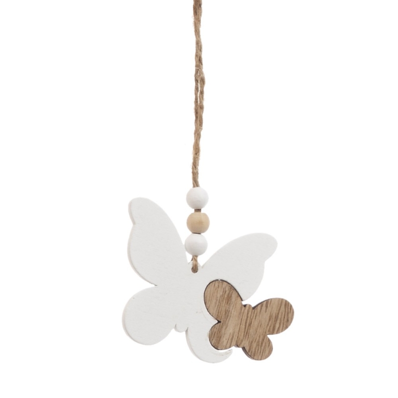 Ξύλινη κρεμαστή διπλή πεταλούδα σε χρώμα λευκό με natural, διακοσμημένη με λευκή χάντρα.Ιδανική για διακοσμήσεις και κατασκευές.