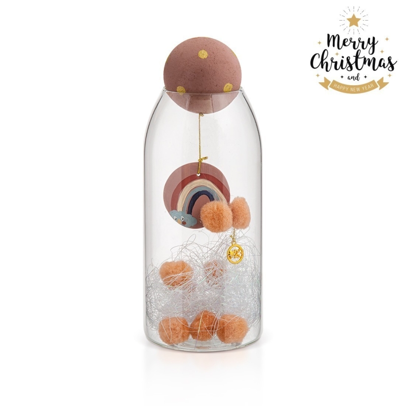 Χριστουγεννιάτικη σύνθεση γυάλινο βάζο με φελλό. Το βάζο είναι στολισμένο σε dust pink χρωματισμούς. Η διακόσμηση αποτελείται από κρεμαστό κεραμικό ζωγραφιστό με το ουράνιο τόξο.