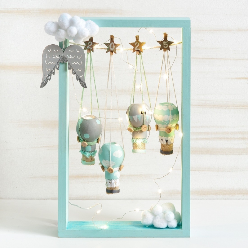 Ξύλινη χριστουγεννιάτικη κορνίζα σε βεραμάν χρώμα με θέμα "Xmas ουρανοκατέβατα". Στην κορνίζα είναι τοποθετημένα 4 κρεμαστά αερόστατα-μπάλες σε αποχρώσεις γκρι-λευκό-βεραμάν. Το επάνω μέρος είναι στολισμένο με μεταλλικά ασημί φτερά και λευκά πον πον σε σχήμα σύννεφου. Τα φωτάκια led δεν συμπεριλαμβάνονται. Έχουν τοποθετηθεί μόνο για την φωτογράφηση.