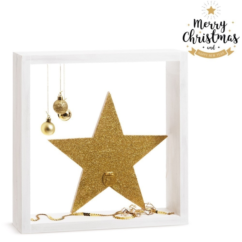 Ξύλινη χριστουγεννιάτικη κορνίζα-πλαίσιο σε λευκό χρώμα με θέμα "Το πιο λαμπρό αστέρι". Το ξύλινο χρυσό αστέρι, οι χριστουγεννιάτικες μπάλες, τα λευκά φωτάκια αποτελούν μια αυθεντική χριστουγεννιάτικη επιλογή δώρου στους αγαπημένους σας. Συνοδεύεται από φωτάκια led που λειτουργούν με μπαταρίες (3 τεμάχια ΑΑ).
