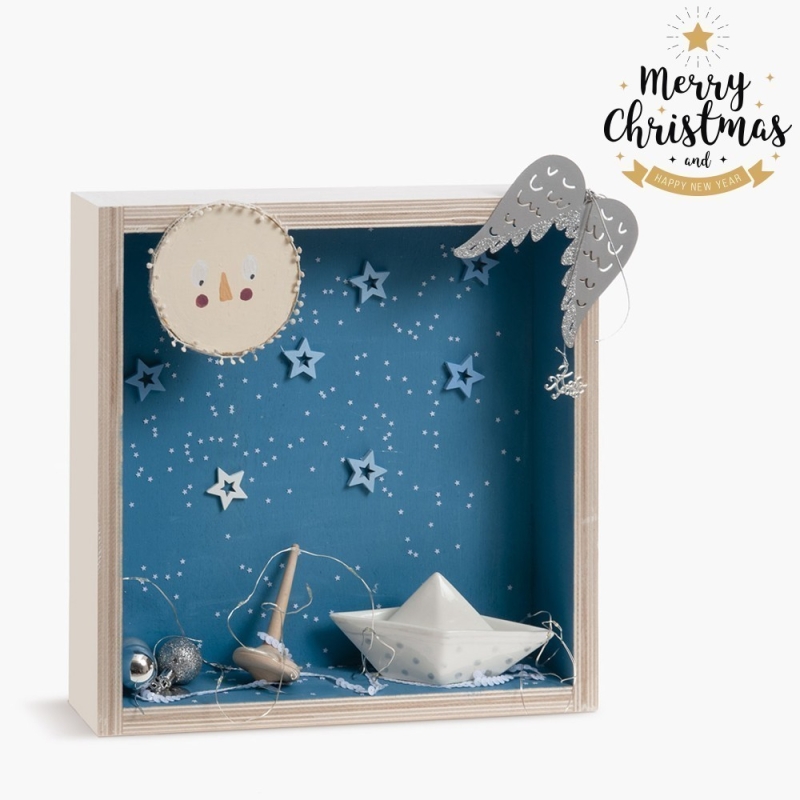 Ξύλινη χριστουγεννιάτικη τετράγωνη κορνίζα με θέμα "Xmas modern and traditional". Το φόντο αποτυπώνει τον απέραντο γαλάζιο ουρανό με τον ελληνικό ήλιο να φωτίζει την πιο παραδοσιακή και ταυτόχρονα μοντέρνα επιλογή χριστουγεννιάτικου δώρου. Πορσελάνινη λευκή βάρκα, ξύλινη κλασσική σβούρα, ασημιές μπάλες, φτερά αγγέλου μας θυμίζουν τα Χριστούγεννα μιας άλλης εποχής. Συνοδεύεται από φωτάκια led που λειτουργούν με μπαταρίες (3 τεμάχια ΑΑ).